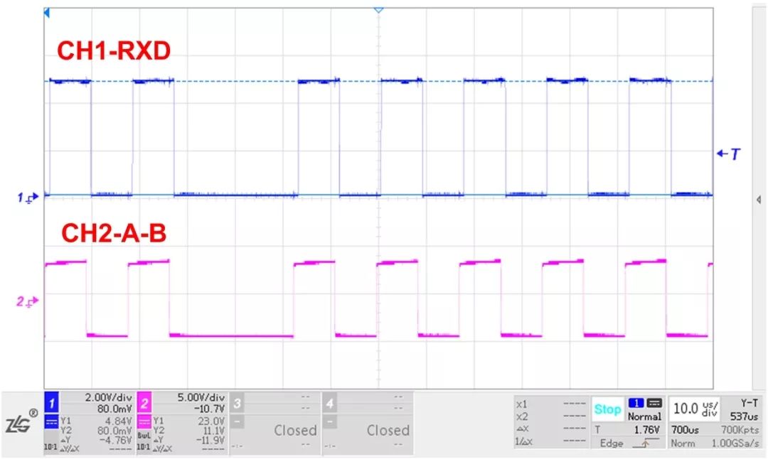 使用图6所示的测试方法得到如图7所示波形,A-B为高电平时,RXD为高电平,A-B为低电平时,RXD为低电平,并且模块RXD输出电平正常,可以判断模块接收功能正常。