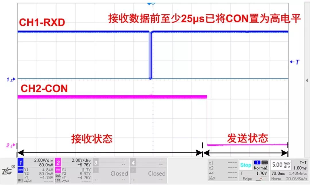 使用如图8所示的方法分别测试TXD、RXD与CON逻辑关系,得到图9和图10所示波形,对于RSM485PCHT,发送或接收信号前,CON引脚应至少提前25μs置为低电平或高电平,并且数据发送或接收完成后再切换收发状态。