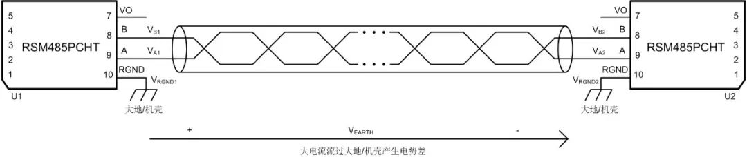 由于两个模块都直接连接至机壳或者大地,当机壳或大地中通过较大电流时,在U1和U2的RGND引脚之间产生了VEARTH电压差,当U1向U2发送数据时,U2的A引脚的电压为: