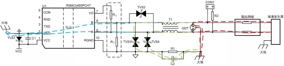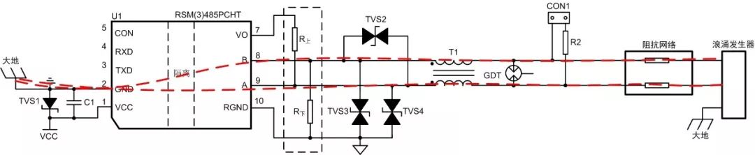 在应用环境中有较高等级的静电和浪涌时,如果只是单纯使用RS-485收发器芯片或者模块,可能会导致模块损坏,此时就需要增加外围保护电路来保护收发器。但保护电路需要可靠地接地才能将静电和浪涌能量泄放。下面以进行共模浪涌测试为例,如图13所示,若保护电路未连接至大地,则浪涌能量(红色部分)通过隔离模块进行释放,较高的浪涌等级容易导致模块损坏;当保护电路接大地时,如图14所示,浪涌能量首先通过GDT泄放到大地,然后通过TVS和电容泄放,剩余很少的能量才会通过模块释放,可以起到保护的作用。