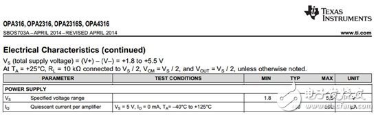 我们将CMOSOPA316运算放大器用作示例并计算其“典型”功率。其电压范围和工作电流在下方的数据表内提供: