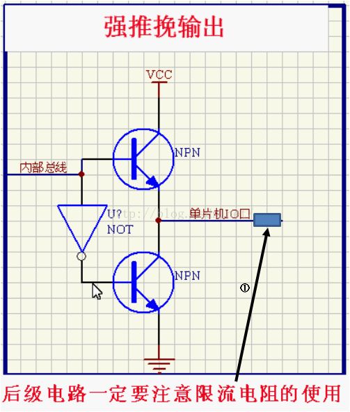 1.内部总线输入高电平, 上面的NPN导通,则IO口输出大电流(因为上面的三极管VCC电源下面没有接上拉电阻, I = VCC/电阻+NPN内部电阻),所以IO出口的地方一般接一个电阻限流内部总线输如低电平, 下面的NPN导通,则此时如果IO口外面接一个VCC(不带上拉电阻),就会有大电流灌输进来