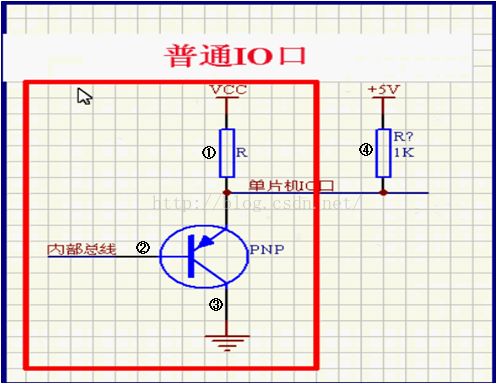 2.这里注意,④位置上是一个上拉电阻,这里设置上拉电阻的考虑因素是这样的,假设我要在这个单片机IO口输出一个电流来驱动小灯发亮,①的位置电阻一般有20k左右,发出的电流250uA,基本上忽略不计,加上一个上拉电阻后, 总电流 = ①位置电流 + ④位置电流(①与④构成并联电路)