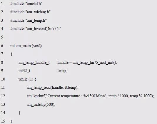AMetal 提供了温度采集的通用接口,仅包含一个温度读取接口,用于读取当前的温度值,其函数原型为(am_temp.h):