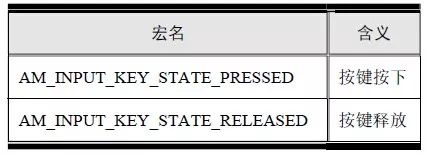 当有按键事件发生时(按键按下或按键释放),均会调用pfn_cb 指向的按键处理函数,完成相应的按键处理功能。当该函数被调用时,传递给p_arg 的值为用户参数,传递给key_code 的值为按键的编码,它是在am_input_code.h 文件中使用宏进行定义的,比如,KEY_1、KEY_2 等,传递给key_state 的值为按键的状态,详见表7.5。