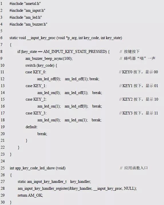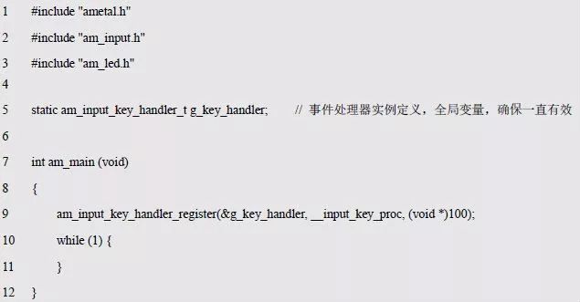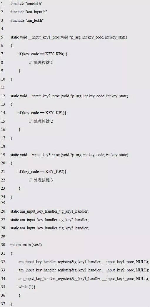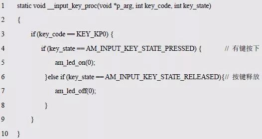 如果不使用,则在调用am_input_key_handler_register()函数时,将p_arg 的值设置为NULL,注册按键处理器的范例程序详见程序清单7.30。
