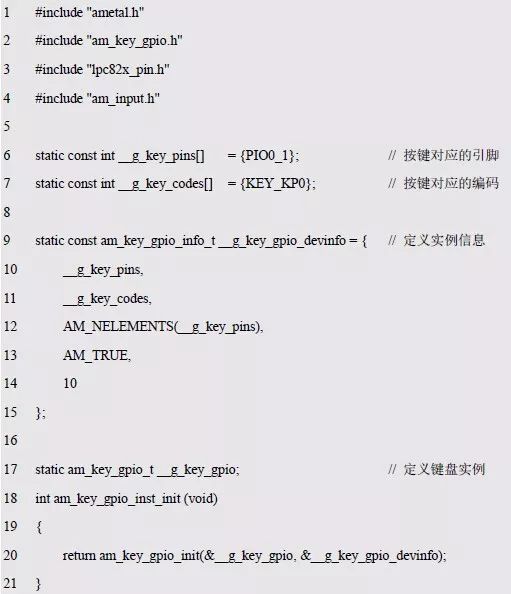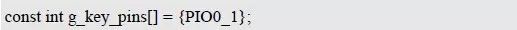 该数组的地址即可作为p_pins 的值。由于AM824 开发板只有一个独立按键,因此数组仅有一个元素,其值为与该独立按键连接的引脚号,即PIO0_1。当存在多个独立按键时,继续在该数组后添加数据元素即可。同时,由于引脚号在系统启动后不会修改,因此使用了const 修饰符。