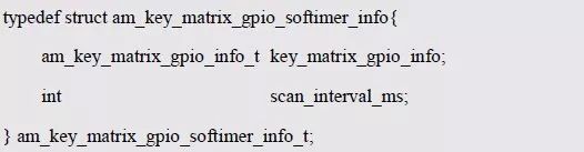 实例信息描述了与矩阵键盘相关的信息,其类型am_key_matrix_gpio_softimer_info_t 的定义(am_key_matrix_gpio.h)如下:
