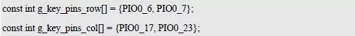 若使用MiniPort-Key 与AM824-Core 相连接时,KR0、KR1 为行线,分别与PIO0_6 和PIO0_7 连接,KL0、KL1 为列线,分别与PIO0_17 和PIO0_23 连接。定义行线引脚数组和列线引脚数组为: