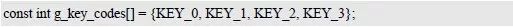 p_codes 指向存放矩阵键盘中各按键对应编码的数组,为了与硬件标号一致,分配给各个按键的编码依次为:KEY_0、KEY_1、KEY_2、KEY_3。则可以定义如下数组: