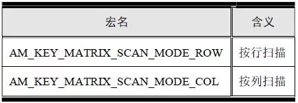 该数组的地址即可作为p_codes的值。active_low 表明按键按下是否为低电平,由电路的设计可知,行线外接了上拉电阻,配置为输入模式时默认会是高电平。因此,应该使用低电平驱动方式,列线输出低电平,当按键按下时,就会检测到低电平, 即该值应为AM_TRUE。scan_mode 表示扫描方式,支持的方式有行扫描和列扫描方式,它们对应的宏名详见表7.6。如使用列扫描,则该值为AM_KEY_MATRIX_SCAN_MODE_COL。基于以