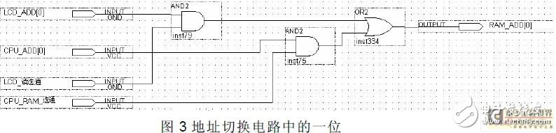图 3是地址切换电路中的一位,以这一位为示例 ,可推出 17位地址全部电路。在图 3中 RAM_ADD=((LCD_ADD&LCD_选通)+(CPU_ADD&CPU_RAM_选通))且 “LCD_读选通”信号与“ CPU_RAM_选通”信号在任何时刻最多只能有一个是有效的,所以当“ LCD_读选通”信号与“ CPU_RAM_选通”生效时可将 RAM_ADD切换到相应的地址线上。如当某时刻“ LCD_读选通”信号与“ CPU_RAM_选通”全无效则 RAM_ADD输出应全为“ 0”。