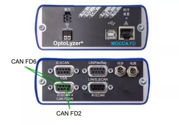 OptoLyzer MOCCA FD配有两个CAN-FD接口,这两个接口也可以配置为CAN高速、CAN低速或单线CAN。此外还配有六个LIN接口和四个标准CAN接口。CAN-FD方面,支持ISO和非ISOCRC计算。 CAN FD时间戳的精度小于一微秒。此外,MOCCA FD还带有触发接口和继电器接口。与PC连接方面,设备配有USB 2.0接口。