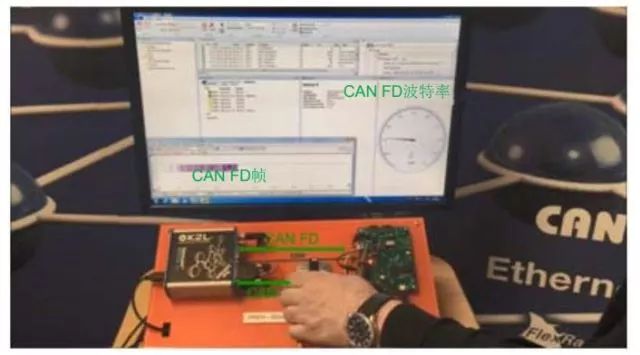 图4中的屏幕截图是后一用例的示例,展示了一个小型CAN FD演示系统。前景中,OptoLyzer MOCCA FD通过CAN连接到Preh IDrive,并通过CAN FD连接到Microchip的CAN FD评估板。另外,还将OptoLyzer MOCCA FD通过USB连接到运行OptoLyzer Studio的PC。这可以从背景中的计算机屏幕看到。PC上较小的窗口来自与Microchip评估板连接的Pico Technology示波器。该窗口显示了通过CAN FD总线传输的CAN FD帧。OptoLyzer Studio借助转速计插件窗口显示了CAN FD数据相位的波特率。在该演示系统中,可以借助IDrive更改CAN FD通信中数据相位的传输速率。