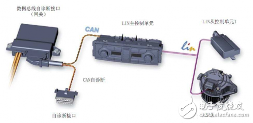LIN主控制单元连接在CAN数据总线上,监控数据传输过程和数据传输速率,发送信息标题,决定何时将哪些信息发送到LIN数据总线上多少次,在LIN数据总线系统的LIN控制单元与CAN总线直接起“翻译”作用,能够进行LIN主控制单元及与之相连的LIN从属控制单元的自诊断。