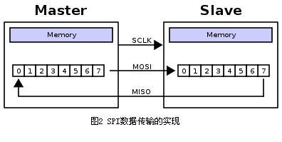 在一个SPI时钟周期内,会完成如下操作:1) 主机通过MOSI线发送1位数据,从机通过该线读取这1位数据;2) 从机通过MISO线发送1位数据,主机通过该线读取这1位数据。这是通过移位寄存器来实现的。如图2所示,主机和从机各有一个移位寄存器,且二者连接成环。随着时钟脉冲,数据按照从高位到低位的方式依次移出主机寄存器和从机寄存器,并且依次移入从机寄存器和主机寄存器。当寄存器中的内容全部移出时,相当于完成了两个寄存器内容的交换。