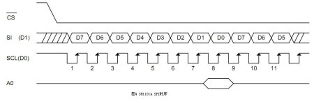在SPI操作中,最重要的两项设置就是时钟极性(CPOL或UCCKPL)和时钟相位(CPHA或UCCKPH)。时钟极性设置时钟空闲时的电平,时钟相位设置读取数据和发送数据的时钟沿。主机和从机的发送数据是同时完成的,两者的接收数据也是同时完成的。所以为了保证主从机正确通信,应使得它们的SPI具有相同的时钟极性和时钟相位。举例来说,分别选取MSP430控制器和OLED驱动SH1101A为主从机,图3和图4为它们的SPI时序。由图4可知,SH1101A的SPI时钟空闲时为高电平,并且在后时钟沿接收数据,则MSP430控制器SPI的设置应与此保持一致。从图3中可以看出,要使得时钟在空闲时为高电平,应将UCCKPL置1;要使得在后时钟沿接收数据,应将UCCKPH清零。