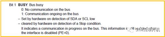 通过单步调试,定位于HAL_I2C_Master_Transmit(),在这个函数中调用的I2C_WaitOnFlagUntilTimeout()无法执行异常,返回HAL_BUSY,导致了I2C写功能失败。在I2C_WaitOnFlagUntilTimeout函数内部,是对忙标志位BUSY@I2Cx_SR2的检测。通过对参考手册的阅读(如下截图所述),如果在未占用I2C总线时,SDA或SCL引脚存在低电平,则意味着总线处于忙状态。这种检测机制在I2C接口失能时依然工作。