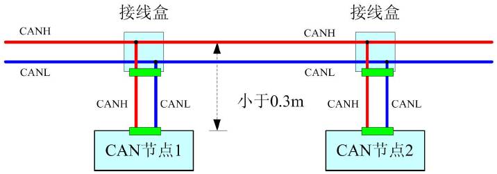 如图5所示,在IOS-11898-2中规定分支长度在1M波特率下不得大于0.3m,1M波特率是CAN的最高波特率,所以其他波特率时,分支长度如果也遵循0.3m规范,则可以稳定运行。