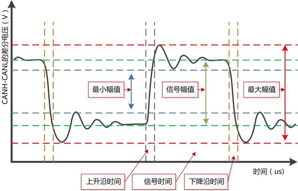 如图6所示,评估节点信号质量需要测量节点CAN差分信号的最小电压幅值、最大电压幅值、信号幅值、波形上升沿时间、波形下降沿时间、信号时间等进行综合评分,具体参数指标在ISO 11898-2中有详细规定。