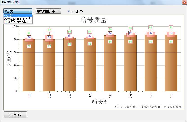 信号质量评估没有专业的工具显然是件麻烦的事情,想要快速评判节点的信号质量,可以使用CANScope的信号质量分析插件一键分析。分析插件通过分析每个CAN节点发出的波形,自动对其进行综合评分,然后通过柱状图来直观显示出每个CAN 帧ID 的信号质量(如图7所示),从而获得每一个节点的信号质量,定量评价节点的物理层质量。