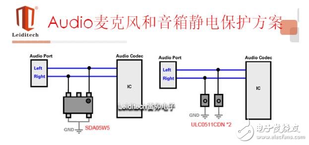 在音频数据线路保护方面,由于音频回路的信号速率比较低,对器件电容的要求不太高,普通电容指标都是可以接受的,有的手机设计中将耳机和麦克风合在一起,有的则是分立线路。前一种情况可以选择单路TVS,而后一种情况如果两个回路是邻近的,则可以选用多路TVS阵列,只用一个器件就能完成两个回路的保护。