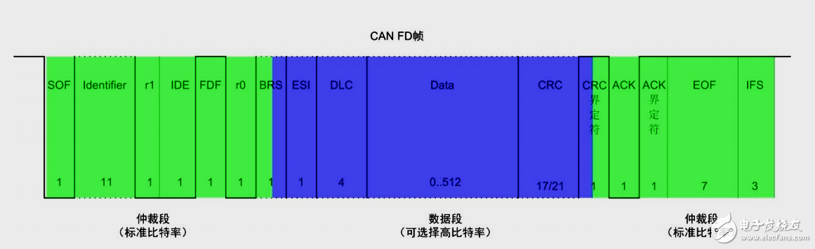 与传统CAN相比,CAN FD取消了对远程帧的支持,用RRS位替换了RTR位,为常显性。IDE位仍为标准帧和扩展帧标志位,若标准帧与扩展帧具有相同的前 11 位 ID,那么标准帧将会由于 IDE 位为 0,优先获得总线。