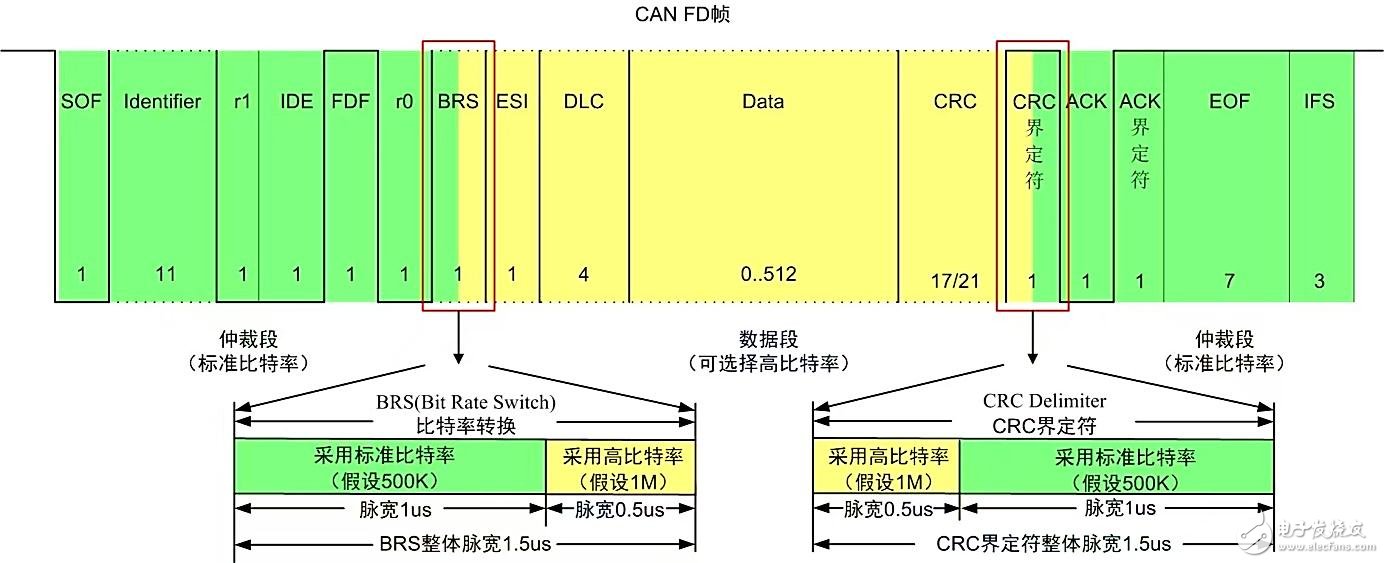 从控制场中的BRS位到ACK场之前(含CRC分界符)为可变速率,其余部分为原CAN总线用的速率。两种速率各有一套位时间定义寄存器,它们除了采用不同的位时间单位TQ外,位时间各段的分配比例也可不同。