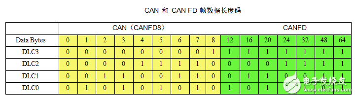CAN FD对数据场的长度作了很大的扩充,DLC最大支持64个字节,在DLC小于等于8时与原CAN总线是一样的,大于8时则有一个非线性的增长,最大的数据场长度可达64字节。如下所示为DLC数值与字节数的非线性对应关系。