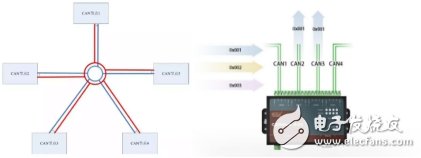 对于星型拓扑结构来说需要注意的是每个分支的终端电阻的匹配,一般等距离分支终端电阻R=N(分支数)*60即可,如果不等距,需要根据实际情况进行匹配,星型组网一般推荐使用(CANHUB-AS4)集线器,能够有效隔离子网络的干扰,延长通讯距离。