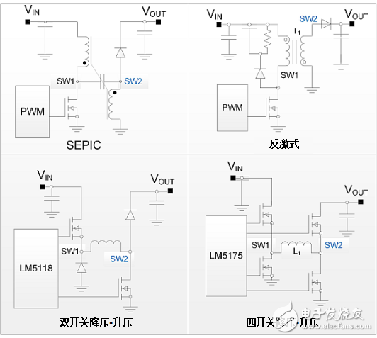 一些拓扑结构符合这些标准,包括单端初级电感转换器(SEPIC)、反激式或非反向降压-升压。非反向降压-升压类别还包括双开关或四开关的选项。图1所示为每个拓扑的简化原理图。