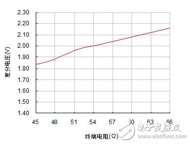 在负载电阻由45Ω不断增大到66Ω时,节点的输出差分电压也随着由1.84V增大到2.16V,两者近似线性关系。为了使发送节点的输出差分电压不至于过低,实际组网时负载电阻应在图 1测试的范围内波动。我们分析RL的组成有3个:终端电阻、总线节点的差分输入电阻、总线本身的有效电阻。