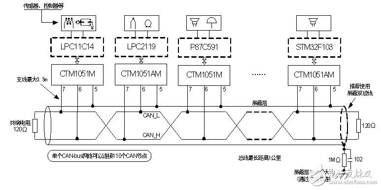目前收发器的最大组网节点数为110个,组网时我们考虑以上的电阻参数,确保总线上的差分电压在合理的范围内即可。