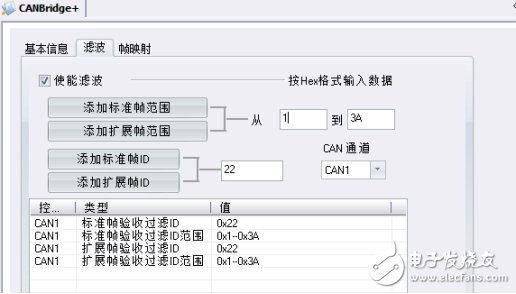 CANbridge+智能网桥具有硬件执行验收过滤的能力,这样能够最大程度上减小自网络的网络负载。简单说来就是它可以充当守门员的角色,按照预先设定的规则过滤特定ID、特定数据的CAN报文。它具备扩展帧与标准帧、CAN1与CAN2单独设置的能力。支持单ID设置以及ID范围滤波设置,不在使能范围内的ID节点的报文将被过滤掉。