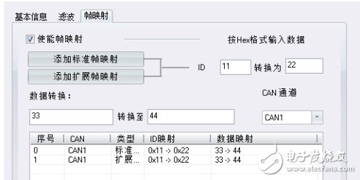 ID转化功能使用的是CANbridge+的帧映射功能,单路最大可设置64条。在某些不方便或者说不能够改变设备ID的场合可以使用帧映射功能实现。除此之外,数据部分也可进行转换。如下图所示,ID为11数据为33的CAN帧被转化为ID为22数据为44的CAN帧。