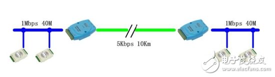 在工程应用中,经常遇到需要将远端的设备数据传输到监控端。比如楼宇监控设备数据上传到控制室,控制室将命令下发到各楼层执行单元,这对CAN的通信距离是个严峻的考验。根据CAN总线应用经验,当波特率为40kbps最长通讯距离才1km。如果您在工程应用中发现CAN总线数据无法上传或者严重丢帧,那么问题极有可能是CAN总线通信距离的限制。针对这种实时性要求不高,通信距离比较远的应用场合CANbridege+非常适合。在5Kbps的通信速率下通信距离能达到10Km。