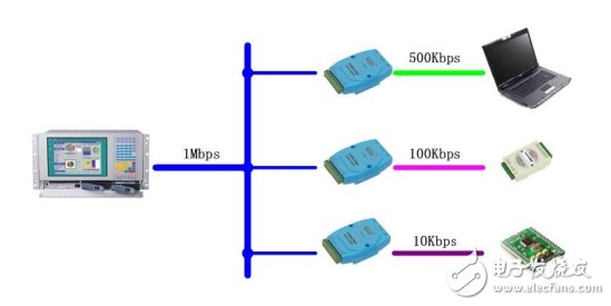 在经济全球化的今天,一个工程中往往会用到多种类型的设备,它们可能来源不同的公司乃至国家,执行不同的标准。比如下图,笔记本主站卡通讯波特率为500Kbps,数采模块通信波特率100Kbps,而微控制器CAN波特率仅为10Kbps。很显然,这些设备不能直接挂载到同一CAN网络中,应用CANbridege+可实现不同设备的波特率匹配。此外,CANbridege+支持使用寄存器配置波特率,轻松应对特殊设备(西门子消防设备波特率40Kbps)。
