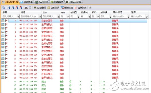 当你在调试CAN总线时出现节点发送报文失败的情况时,一定要检查是不是以上几点疏漏导致你的总线上ACK异常。而借助恰当的仪器,可以在查找CAN总线错误时事半功倍。图4即采用致远电子的CANScope来对错误帧进行标记,同时找到错误帧对应的波形来查找出错误情况。CANScope还可以对CAN总线物理层、数据链路层、应用层做一系列的测试,为CAN工程师解决测试难题。