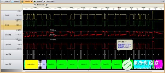 从图中可以看出CAN协议采取了差分信号传输的方式,可以有效杜绝来自外部的屏蔽干扰。而在最后一行的协议解析部分,进过观察我们发现一帧信号被分割成了不同颜色的一段段,每一段究竟是何含义?保证信号正确传输的秘密就隐藏在这些段落里。让我们来庖丁解牛分别为大家分析下。