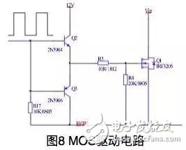 图7电路输出小电流的PWM波,为了使MOS快速开通和关断,需要大电流的驱动电路,利用三极管小电流控制大电流的原理,采用推挽输出方式,如图8所示: