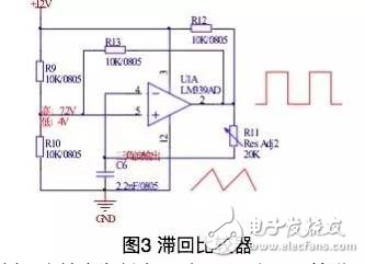如图2所示,为一个典型的比较器电路,R9和R10电阻分压给出一个参考电平;因为比较器内部是OC输出,所以输出端要接一个上拉电阻R12;三角波产生的实质是对电容的充放电过程,那么什么时候充电,什么时候放电呢?这个可以利用负反馈的原理,当比较器输出为高电平,则对电容充电;当输出为低电平时,电容放电。但对图2分析,会发现这里正输入端只有一个电平6V,当电容充至大于6V就输出低电平,这就开始放电;当放电电压小于6V时又输出高电平,开始对电容充电,这样输出的近似为一条直线或者说幅度很小的三角波,不能使用。所以接下来的问题是怎么使参考电平可变,从而输出幅度较大的三角波。这里还是巧妙的选择反馈,利用输出的高低电平不同,从而改变输入端的电平切换,如图3所示: