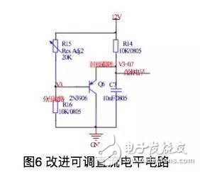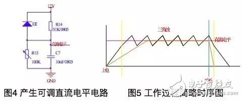 采用如图4所示电路,电源经过R14对电容缓慢充电,断电后电压经过续流二极管快速放电,即慢充快放。整个时序过程如图5所示,直流电平接比较器正输入端,三角波接负输入端,在开机阶段,三角波充电速度快于直流电平充电速度,占空比为0;在关机阶段,直流电平放电速度快于三角波放电,占空比仍然为0,满足设计的初衷。但是图4电路有个不足,在电路正常工作阶段,降低直流电平时,由于电容放电要经过滑阻,速度慢,所以需要改进,改进电路如图6所示: