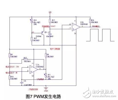 接下来就是直流电平信号和三角波信号分别输入到比较器的正负输入端,输出一个稳定的PWM波,电路如图7所示。
