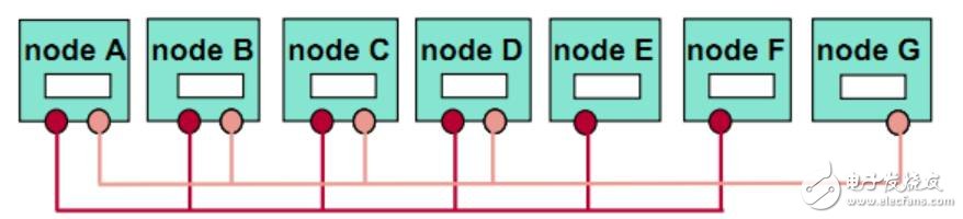FlexRay的拓扑结构可分为单信道和双信道,包括单信道总线型、单信道星型、单信道混合型和双信道可独立选择拓扑形式。如图1所示为单信道总线型,图2为双信道拓扑形式。