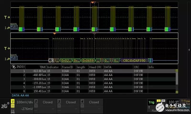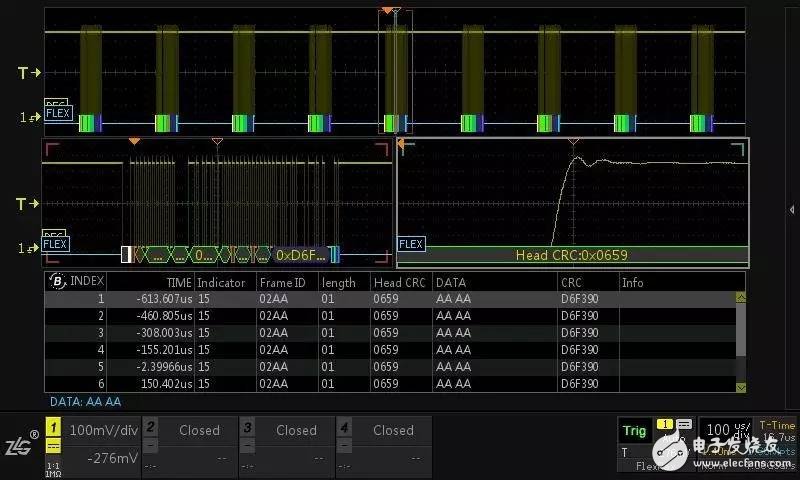 依托于ZDS4054 Plus示波器强大的运算平台,我们免费标配FlexRay协议的解码功能。既可以对512M全内存的FlexRay数据进行解码,又可以对车辆通讯信号监测,每一帧数据的信息均可在事件表中进行查看,如下图6所示: