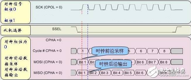 我们来关注SCK的第一个时钟周期,在时钟的前沿采样数据(上升沿,第一个时钟沿),在时钟的后沿输出数据(下降沿,第二个时钟沿)。首先来看主器件,主器件的输出口(MOSI)输出的数据bit1,在时钟的前沿被从器件采样,那主器件是在何时刻输出bit1的呢?bit1的输出时刻实际上在SCK信号有效以前,比SCK的上升沿还要早半个时钟周期。bit1的输出时刻与SSEL信号没有关系。再来看从器件,主器件的输入口MISO同样是在时钟的前沿采样从器件输出的bit1的,那从器件又是在何时刻输出bit1的呢。从器件是在SSEL信号有效后,立即输出bit1,尽管此时SCK信号还没有起效。