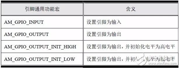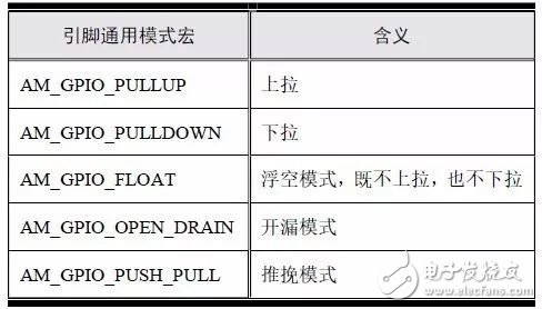 flags 为配置标志,由“通用功能 | 通用模式 | 平台功能 | 平台模式”(‘|’就是C 语言中的按位或)组成。通用功能和模式在am_gpio.h 文件中定义,是从标准接口层抽象出来的GPIO 最通用的功能和模式,格式为AM_GPIO_*。通用功能相关宏定义与含义详见表5.1,通用模式相关宏定义与含义详见表5.2。