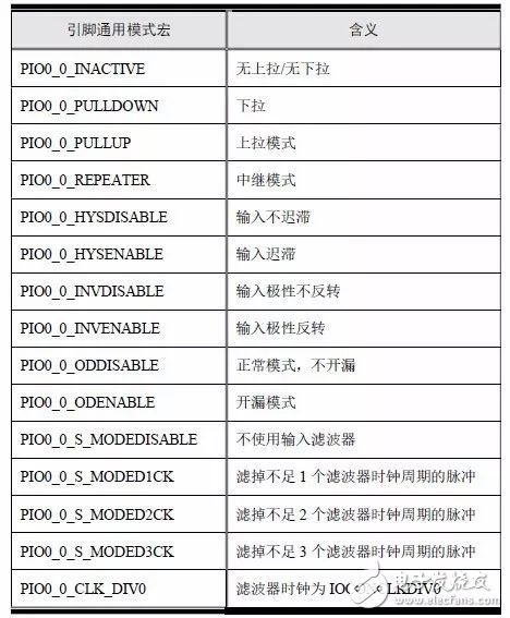 平台功能和模式与具体芯片相关,会随着芯片的不同而不同,平台功能和模式相关的宏定义在lpc8xx_pin.h 文件中定义,芯片引脚的复用功能和一些特殊的模式都定义这个文件中,格式为PIO*_*_*,比如,PIO0_4_UART0_TX,PIO0_4 的串口0 发送。