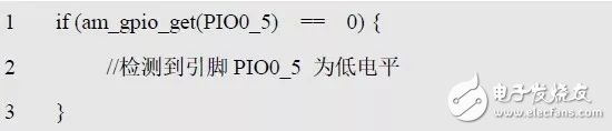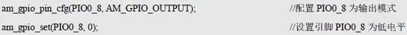 其中的Pin 为引脚编号,格式为PIOx_x。比如,PIO0_0 用于翻转PIO0.0 引脚的电平状态。如果返回AM_OK,说明操作成功,使用范例详见程序清单5.6。