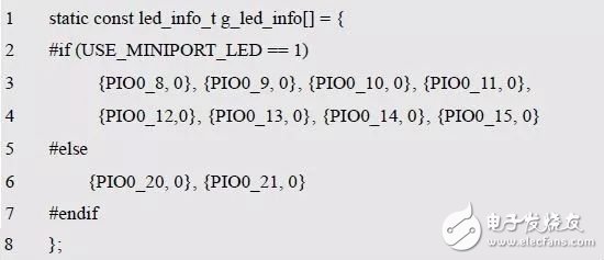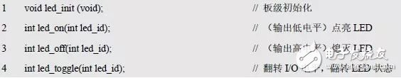 其中的led_id 对应的LED 编号,为了方便调用者以后不用再查看原理图,则将LED 与GPIO 的对应关系定义在一个数组中,其相应的代码详见程序清单5.11。